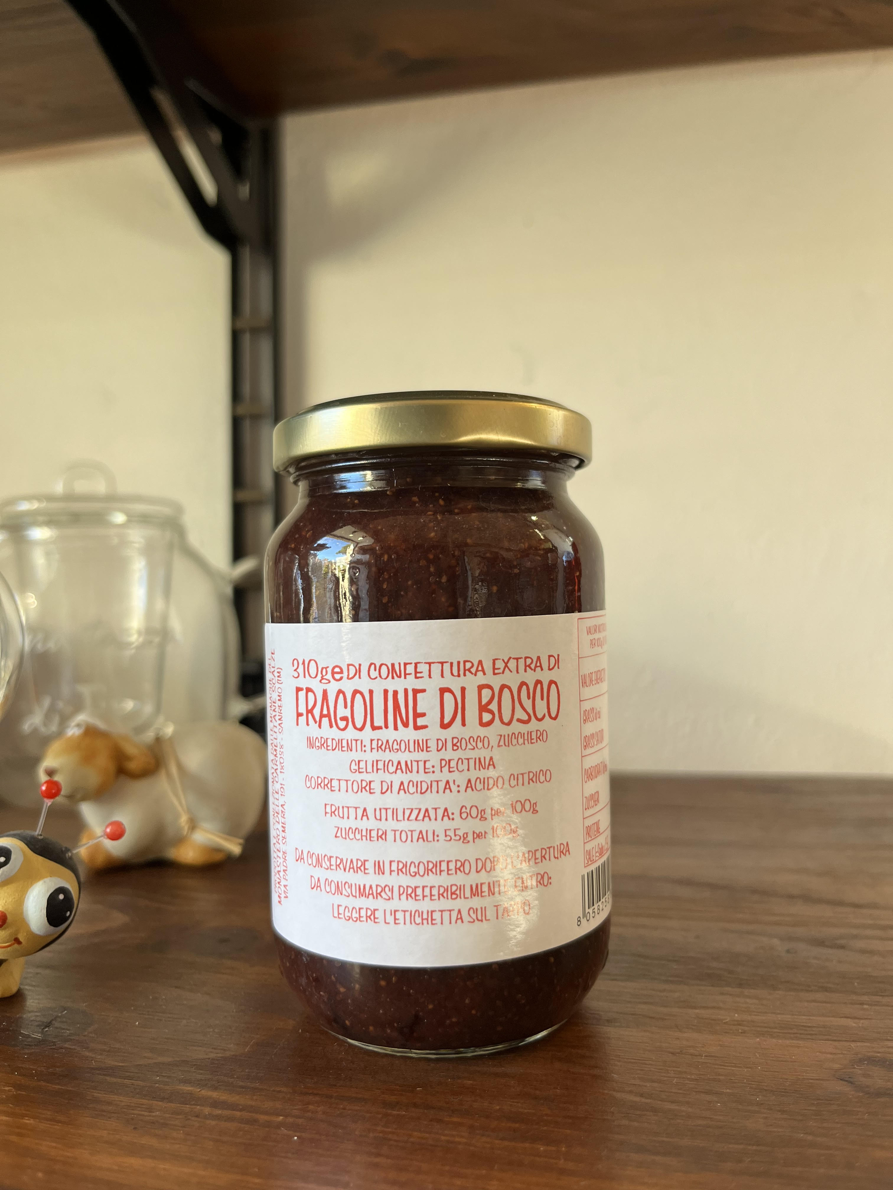 Ingredienti: fragoline di bosco, zucchero, gelificante pectina, correttore di acidità acido citrico.