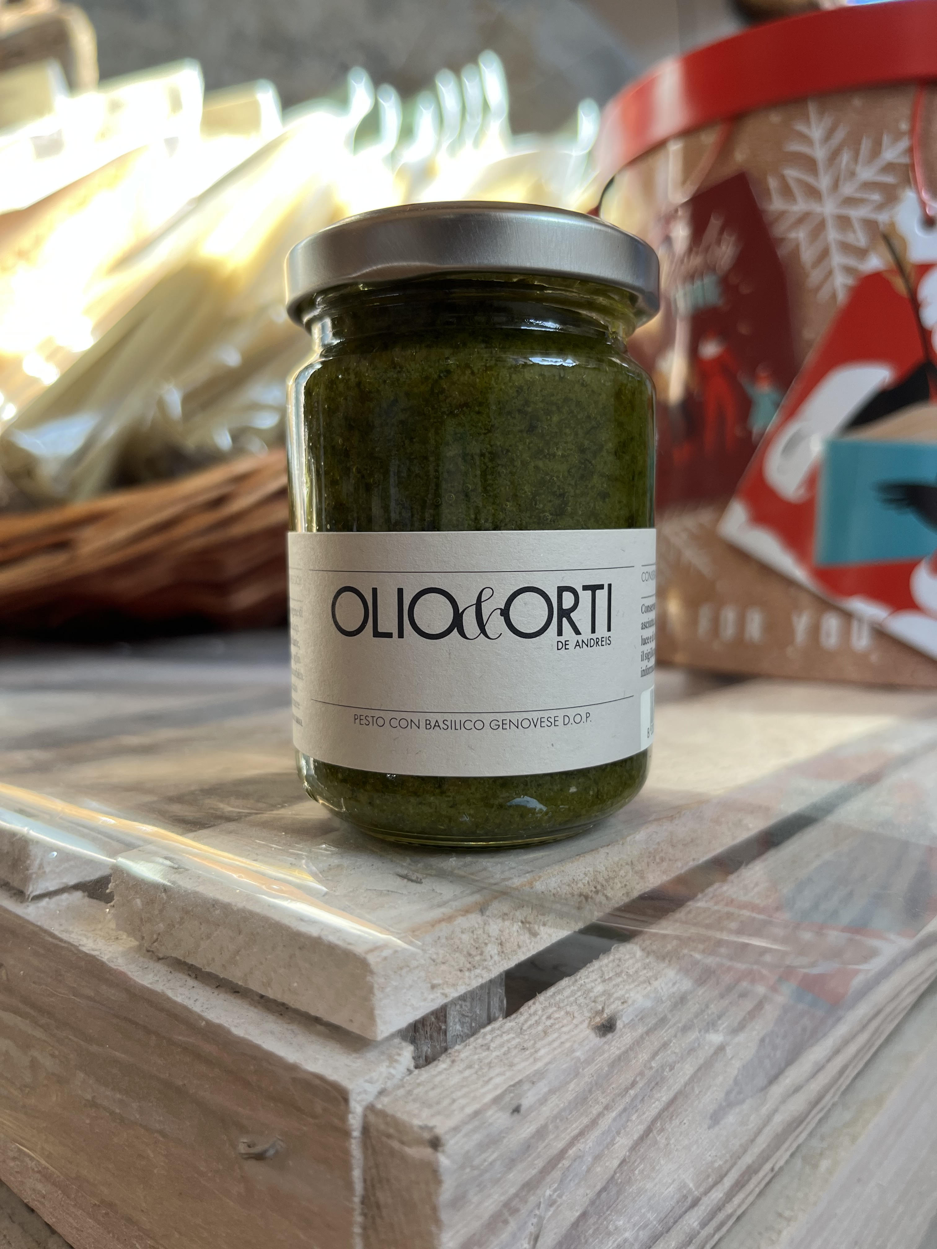 Ingredienti: olio EVO, basilico genovese dop (14%), pinoli, proteine del latte, formaggio, sale, panna, aglio antiossidante acido ascorbico, correttore di acidità acido lattico.